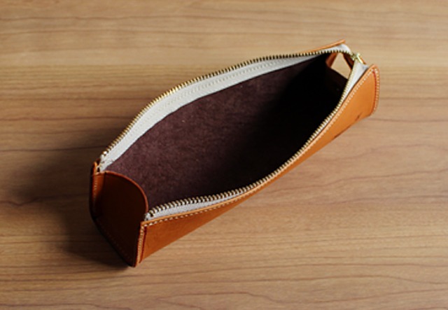 ペンケースに布地の裏地を使用するとペンの先が引っかかって布を傷めてしまうことがあるので、豚革のスウェードを使用しました。