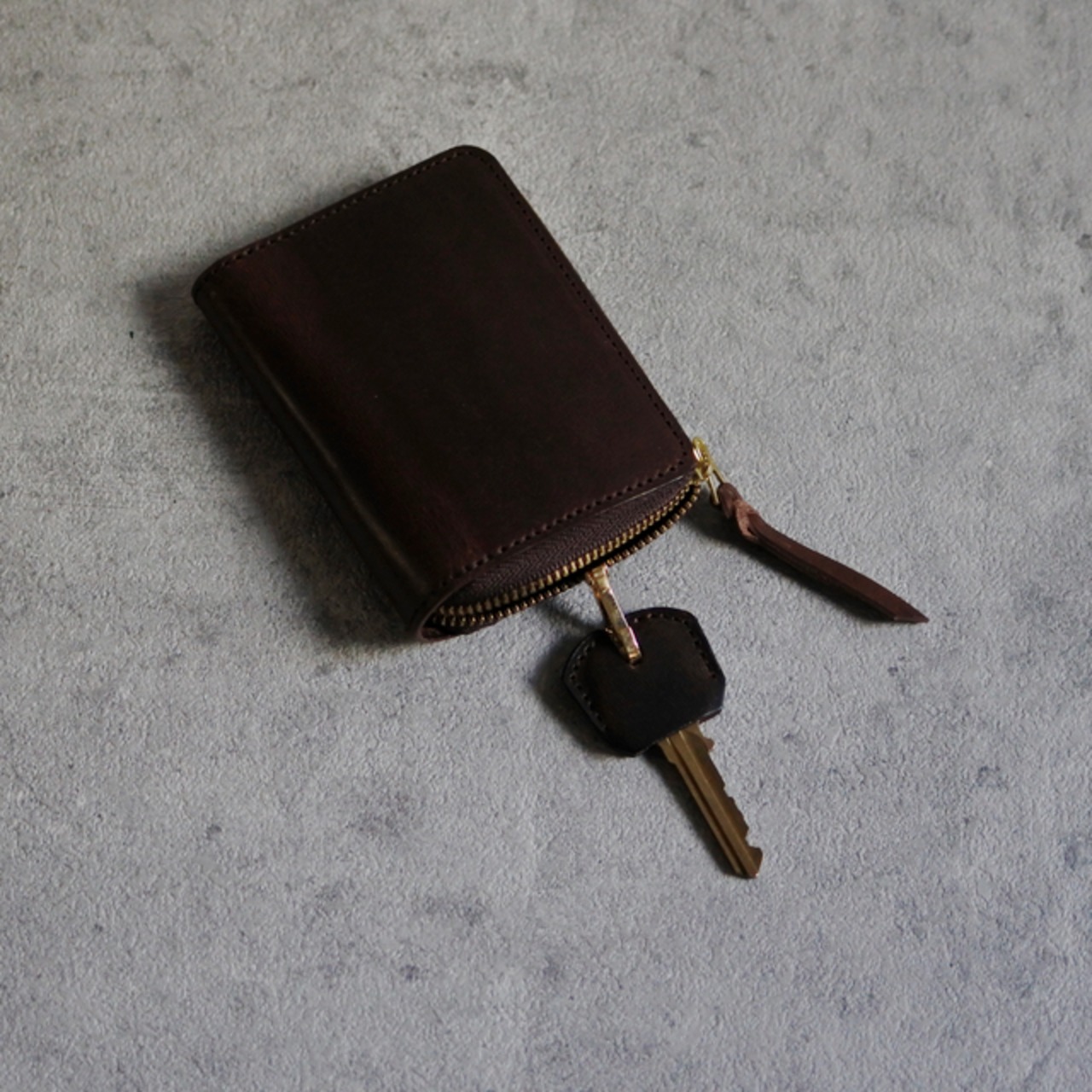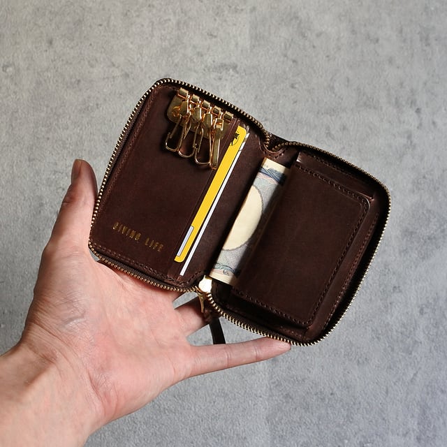 キーケースなので鍵はもちろん、カードと小銭や少しのお札を入れても、ラウンドファスナータイプなので薄く綺麗に小さく収まります。
