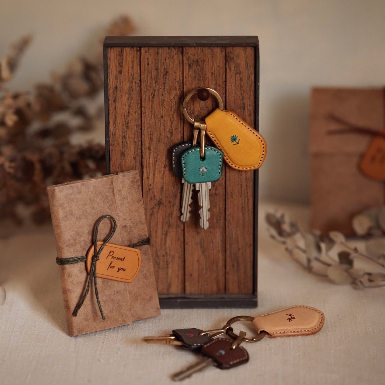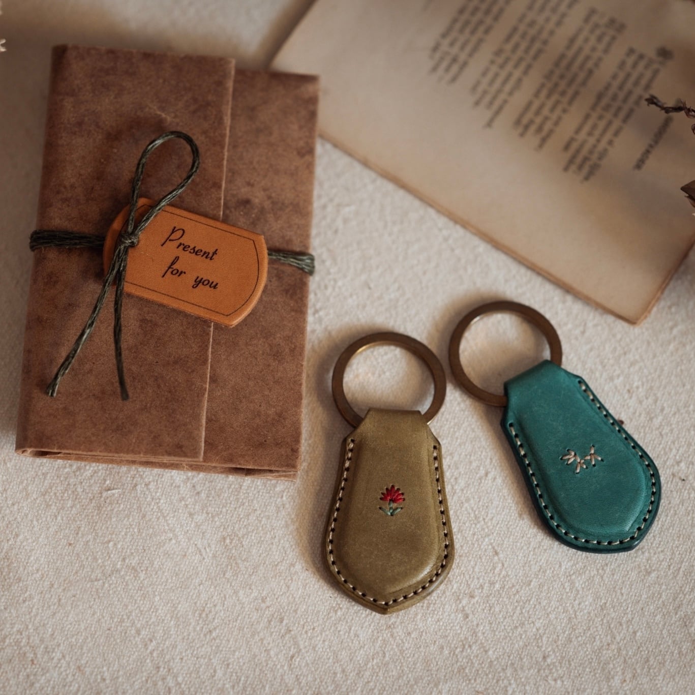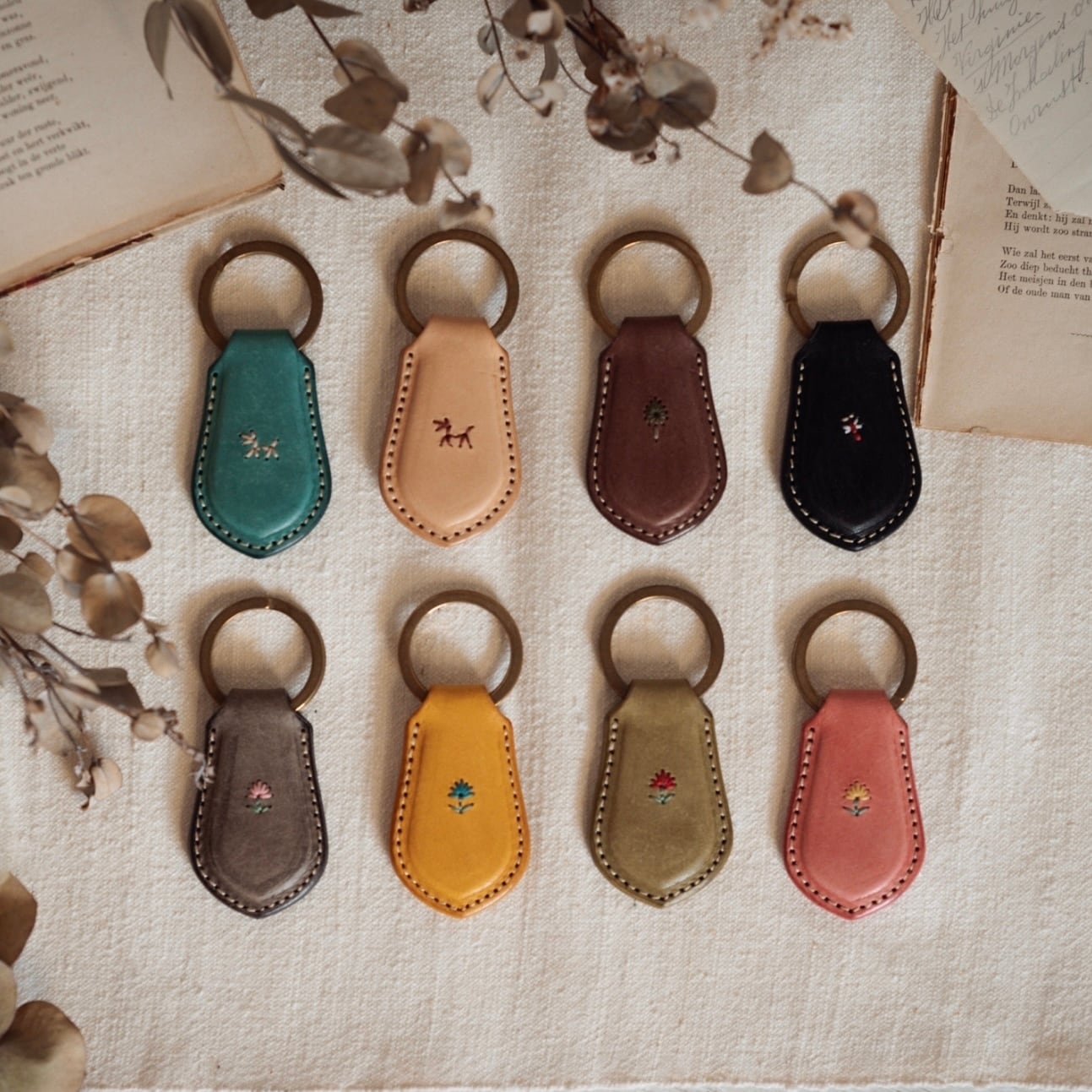 革と刺繍の組み合わせでオリジナルのキーホルダーを製作いたします。