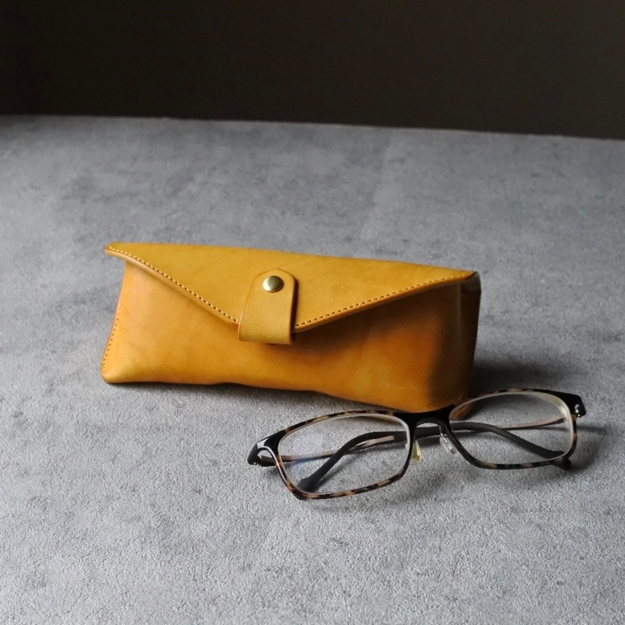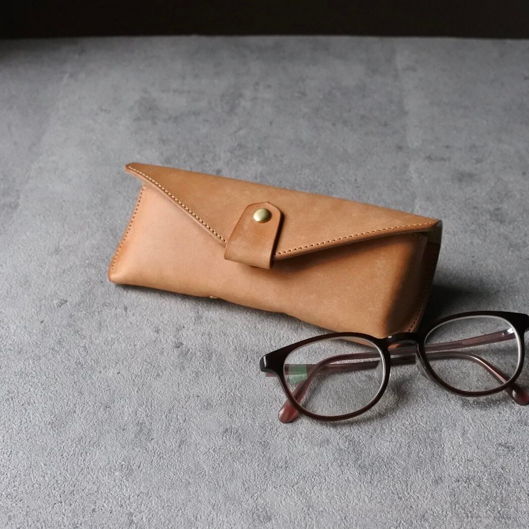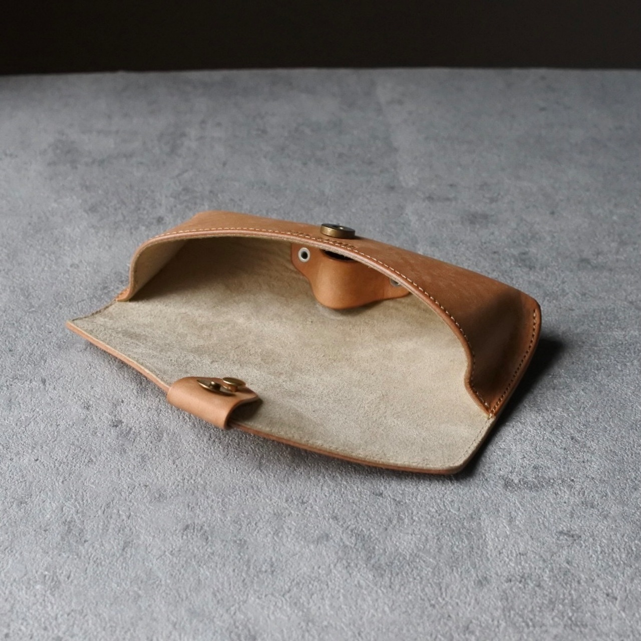表面は硬めでしっかりとしたオイルドレザー、裏地には眼鏡にキズがつかないように豚革スウェードを使用しました。