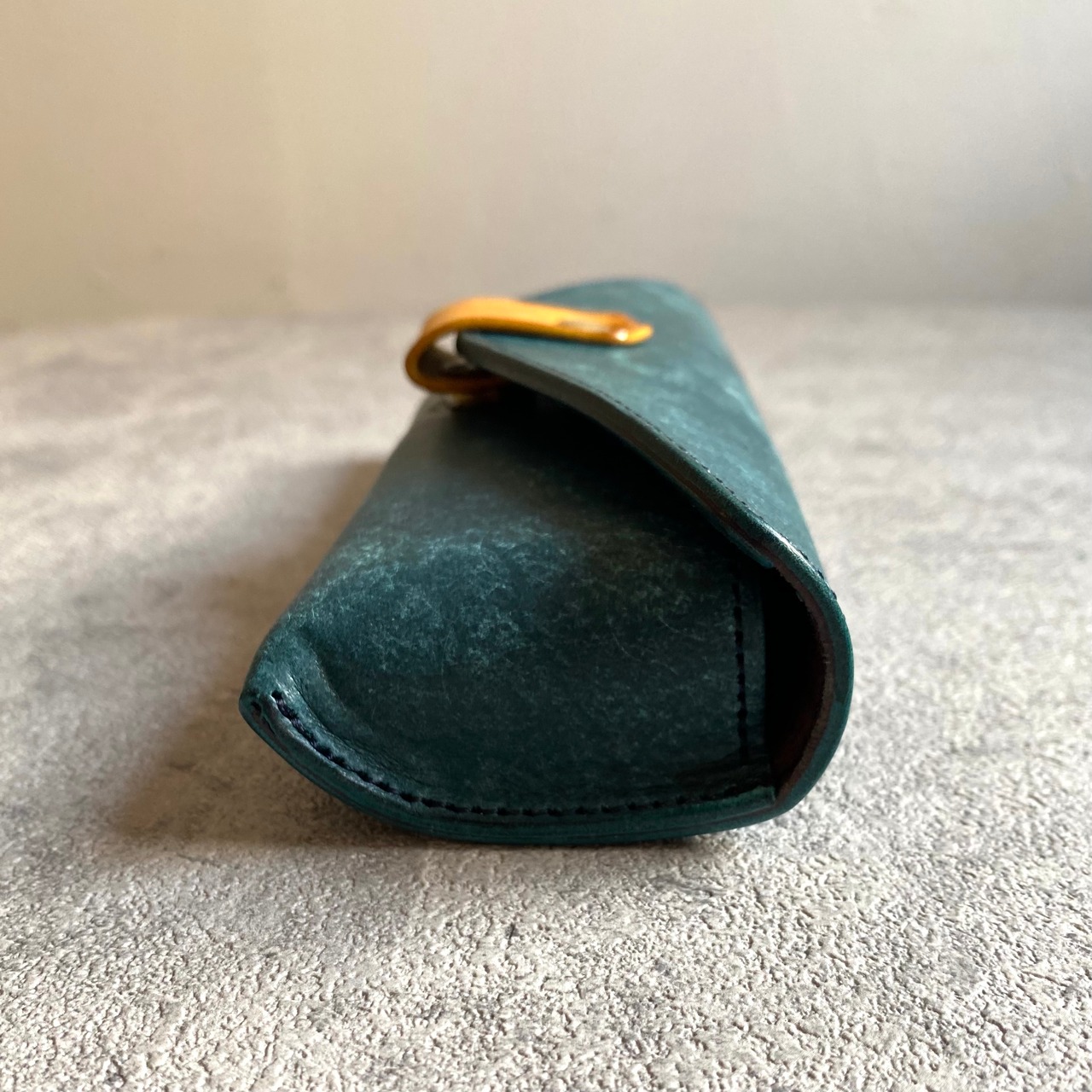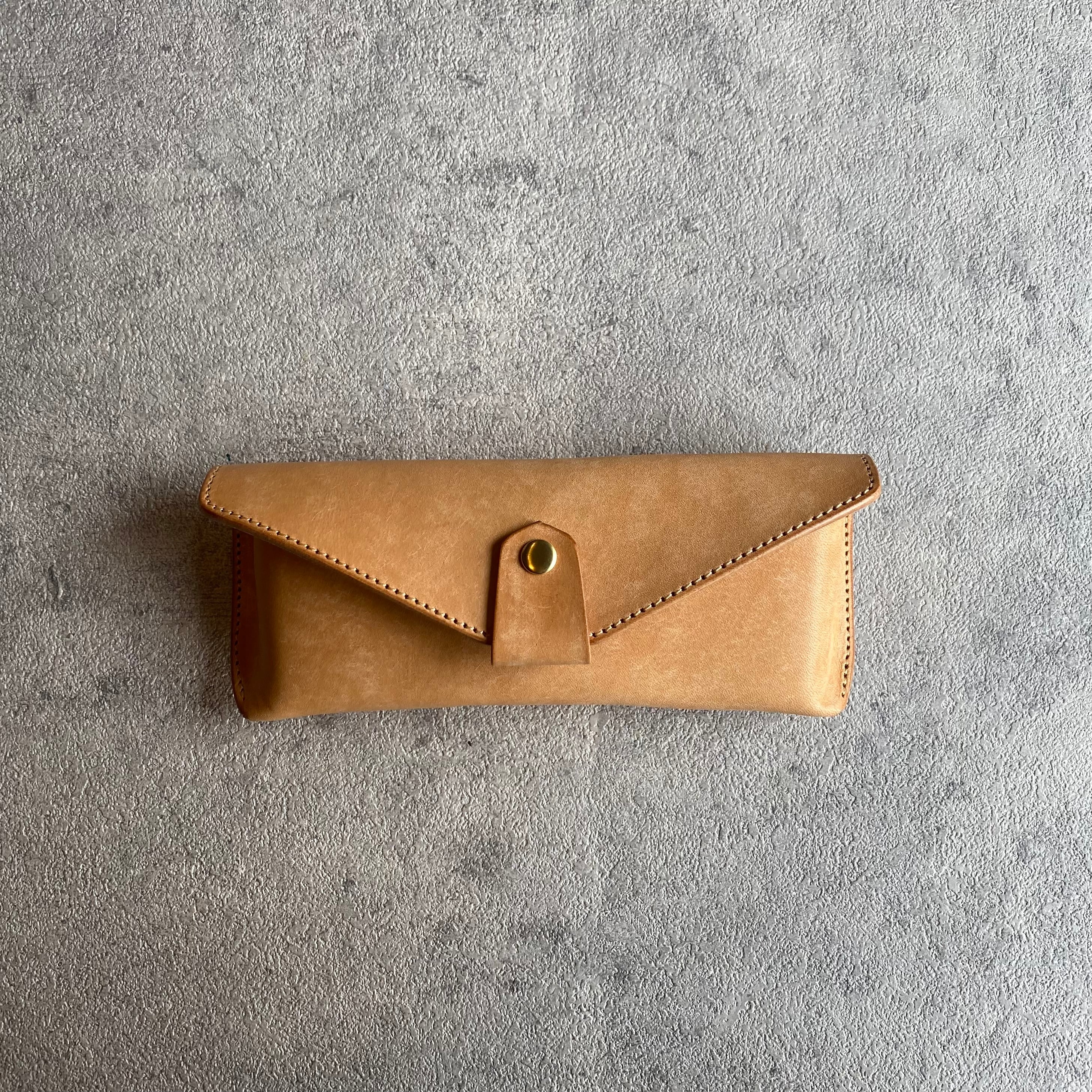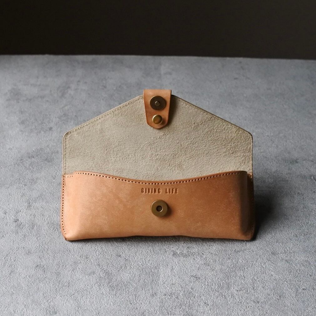表面は硬めでしっかりとしたオイルドレザー、裏地には眼鏡にキズがつかないように豚革スウェードを使用しました。